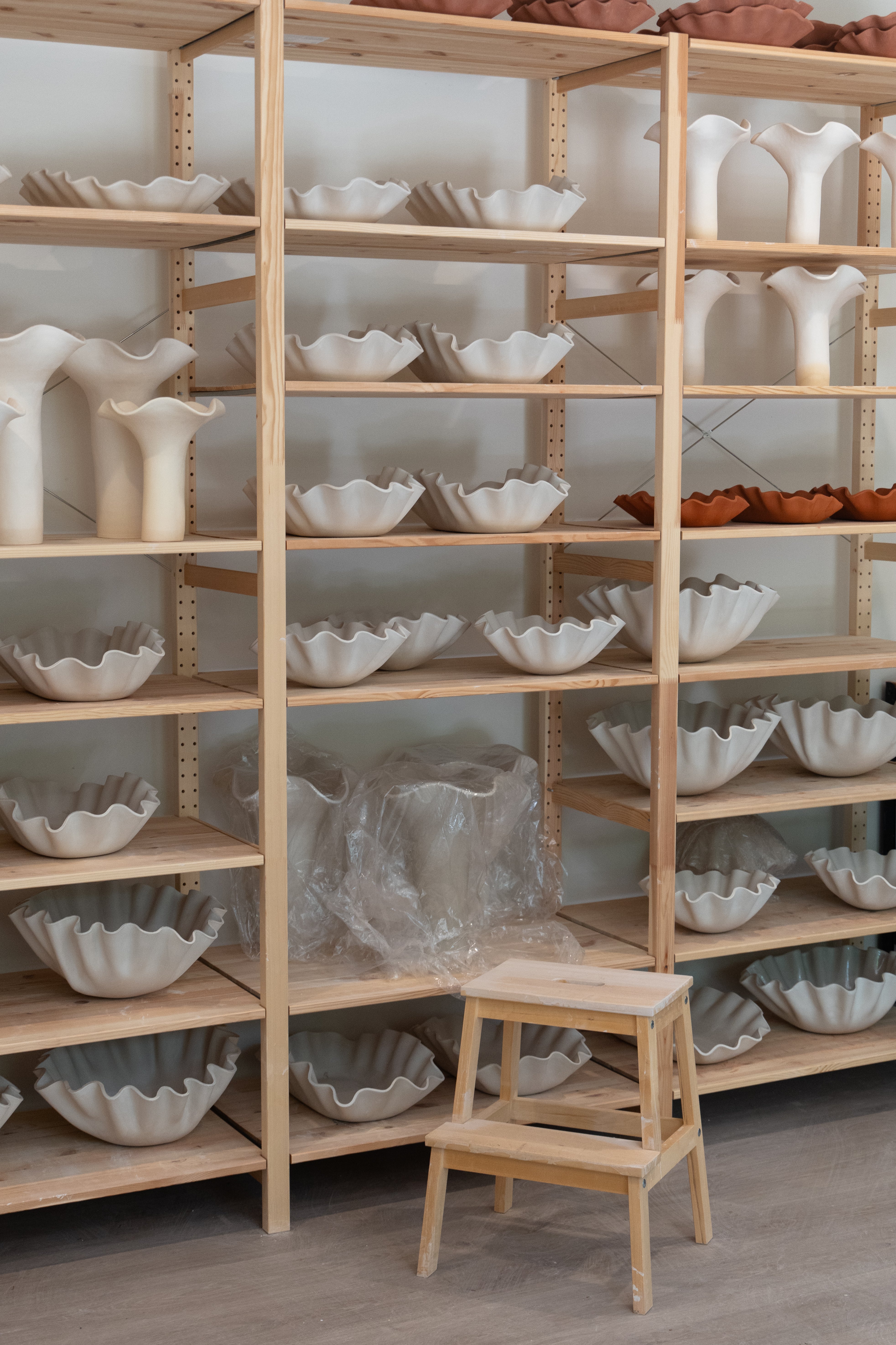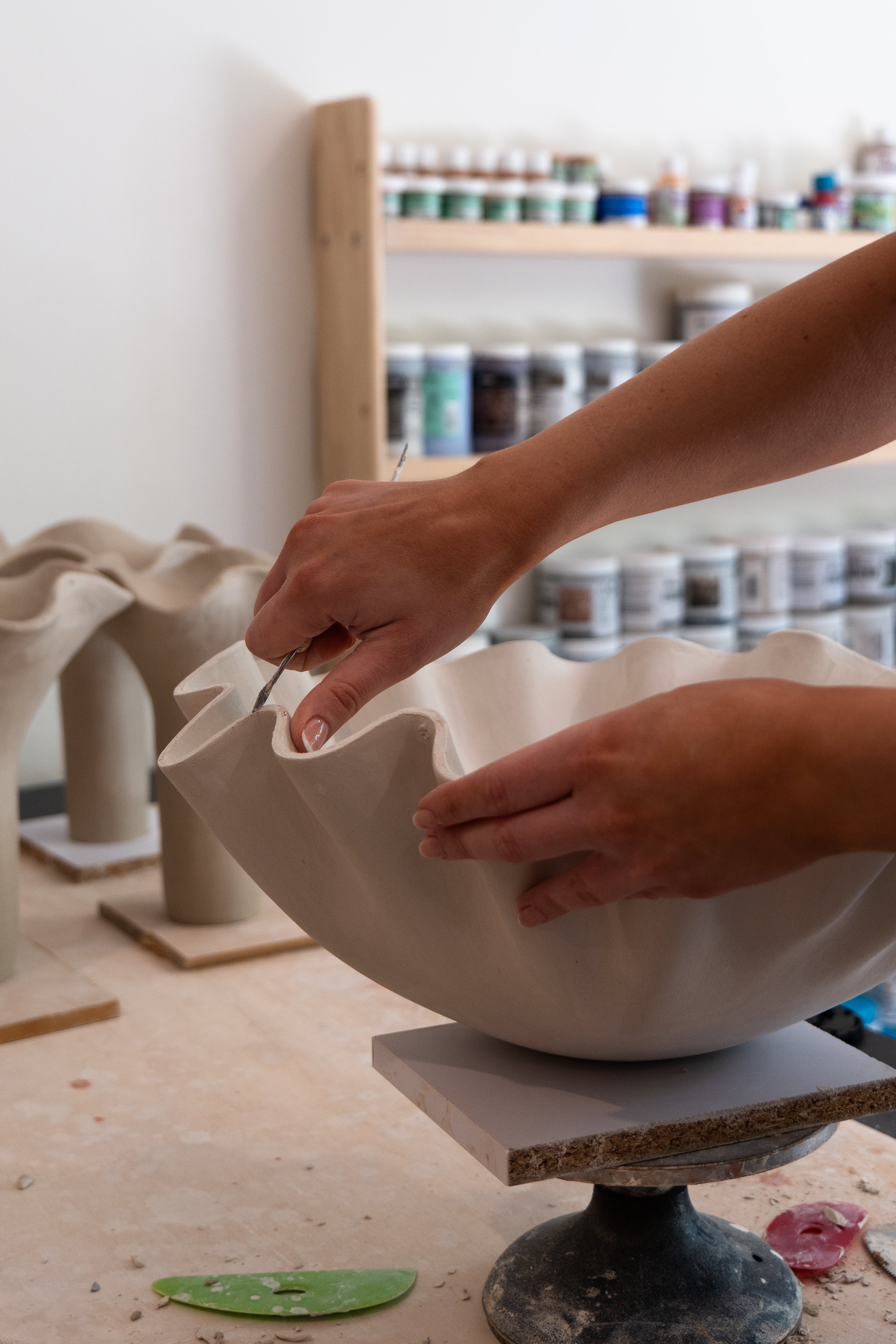 Today, her work is defined by graceful sculptural vessels - an ode to nature's gentle, imperfect forms. Working from her home studio, she builds each piece using slabs, coils, or a combination of the two. Every curve, ruffle, and contour is shaped by hand, resulting in ceramics that are entirely one-of-a-kind.