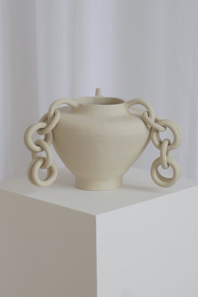 Large vase with three handles and dangling chains. Unglazed stoneware
